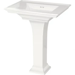 The Town Square S Pedestal Sink by American Standard introduces a sense of classic architecture into any style of bathroom, whether it is traditional or transitional. Elegant architectural details such as crown molding and stately square shapes accent this signature design for a perfectly coordinated collection, making it easy to create a bathroom space that looks great for years to come. The pedestal sink allows for a space-saving option, while still providing a generous useful working space in the bathroom.